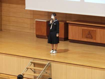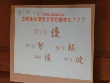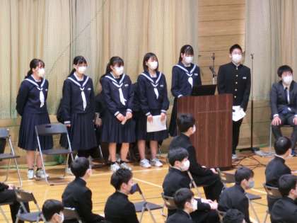 卒業生を祝う会1 公開日 2022/03/14 更新日 2022/03/14 生徒会 3月14日(月)4限 凜とした予行練習が終わった後、1・2年生が1か月以上前から準備してきた「卒業生を祝う会」を行いました。最初に祝う会の実行副委員長が「みんなで楽しんでください」と3年生に呼び掛けました。 最初は企画班からの発表で、3年生のアンケート調査をもとにしたクイズ大会。大変盛り上がりました。