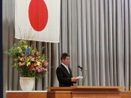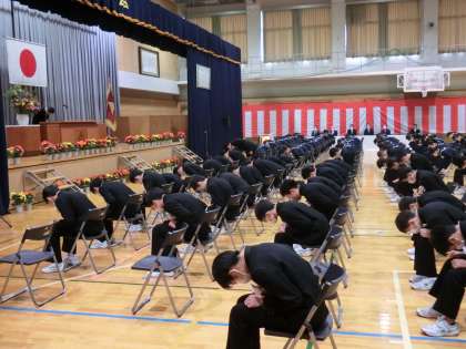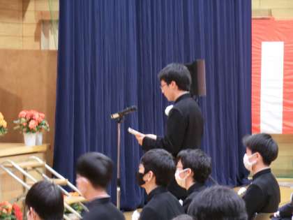 PTA会長が、祝辞を伝えたあと、卒業生の代表に記念品を贈りました。卒業生の代表者がお礼の言葉を述べました。