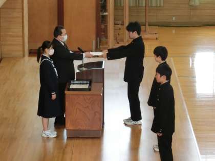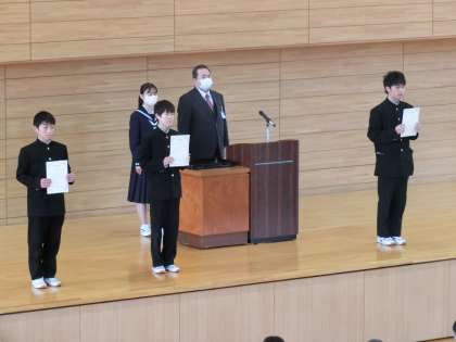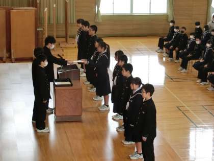 生徒会役員認証式1 公開日 2022/03/23 更新日 2022/03/23 生徒会 3月23日(水)1限 体育館で、令和4年度前期生徒会役員の認証式を行いました。校長が生徒会長と副会長に認証書を授与し、生徒会長が執行委員と専門委員長に任命証を授与しました。