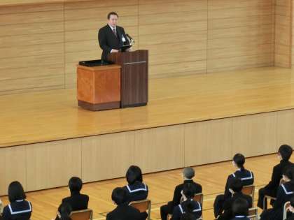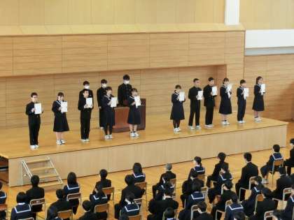 生徒会役員認証式2 公開日 2022/03/23 更新日 2022/03/23 生徒会 新役員を代表して、生徒会長が「先輩から受け継いだ伝統を大切にして、みんなで頑張っていきたい」と抱負を述べました。 校長が、ハドソン川に不時着した旅客機“ハドソン川の奇跡”の話をもとに、「一人では奇跡は起きない。全校生徒の力が合わさったときに奇跡は起きる。一人一人が今できることに全力で取り組んで欲しい。」と伝えました。