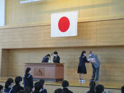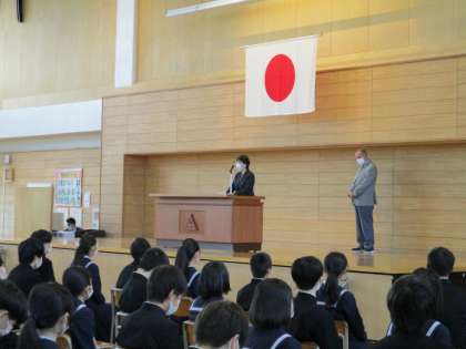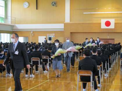 4月6日(水)退任式 公開日 2022/04/06 更新日 2022/04/06 学校行事 退任式が行われました。退任される教職員の方々にとって人生の節目となる厳粛な式となりました。 生徒は、人生の先輩から、今後の糧となる温かい言葉をいただき、感謝の思いでいっぱいになっていました。 代表生徒が、長年の勤務に対して謝辞を述べました。
