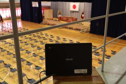在校生は、式には参加できませんが、同じ校舎内で情報端末(クロームブック)を活用してリモート中継で新入生の入学式を見守ります。