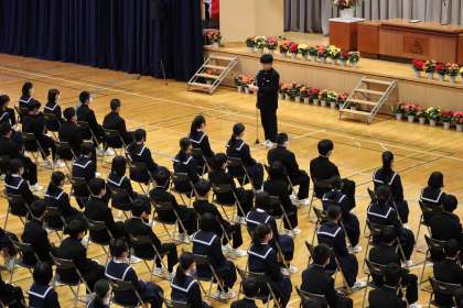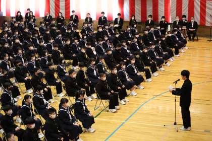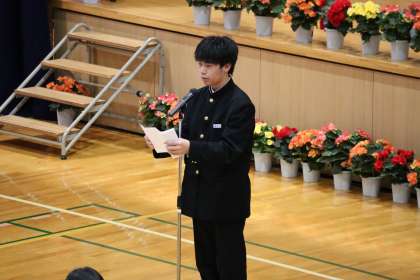 4月8日(金) 令和4年度 入学式(5) 公開日 2022/04/08 更新日 2022/04/08 学校行事 生徒会長が歓迎の言葉を述べました。 新入生の不安が取り除かれるように、温かく語りかけました。 共に明るい挨拶が交わされる明るい学校にしていきましょう。行事や部活動にも積極的に参加し、充実した中学校生活にしていきましょう。 そして、中学校生活が掛け替えのない時間となるようにしていきましょう。 と言葉を送りました。