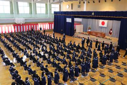 4月8日(金) 令和4年度 入学式(6) 公開日 2022/04/08 更新日 2022/04/08 学校行事 コロナ禍であるため、校歌は静聴しました。 昨年度の卒業生が歌った校歌を録音したものが流されました。新入生は、はじめて聴く校歌に耳を傾けていました。 そして、粛々と全行程を終了し、学級担任の誘導で退場しました。 このあと、初めての学活となります。