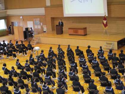 式辞で校長先生から、今年の3月で卒業生が22,251名となったことや、『新庄』の名称が奈良時代の『新たな荘園』に由来する説もあることなど、今までの歴史を紐解きながら語りかけ、歴史ある新庄中の生徒としての誇りをもってほしいと願いが伝えられました。