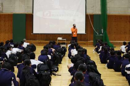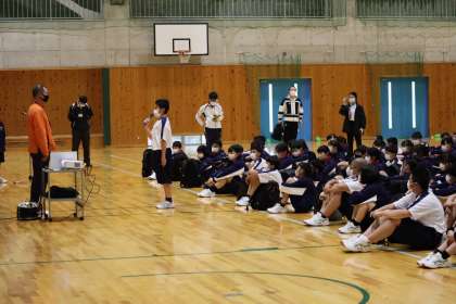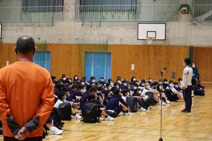 4月26日(火)9:40 1年 校外学習(入所式の様子) 公開日 2022/04/26 更新日 2022/04/26 1学年 入所式を行いました。 学年の代表が、ルールを守って楽しみたいと思いますと挨拶をしました。 所員の方からは、聞く姿勢ができていて大変素晴らしいと褒めていただきました。 キーワードの『あじかき』を意識して良き研修にしてくださいと言葉をいただきました。 あ 挨拶 じ 時間を守る か 環境について考える き 来た時よりも美しく