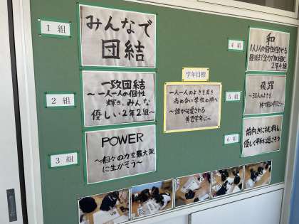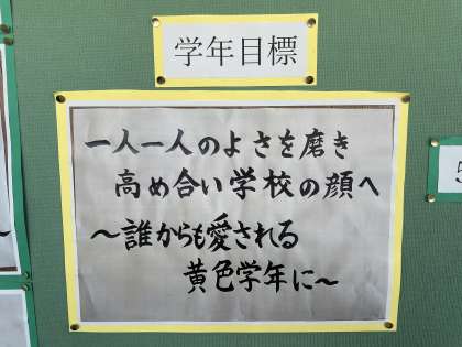 2学年廊下の掲示物「学年目標と学級目標」を紹介します。