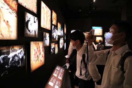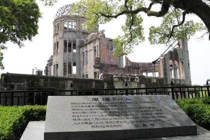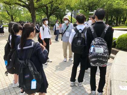2組です。 平和資料館で学んだ後、ガイドさんと共に碑巡りを行っています。