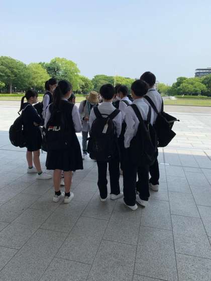 6組です。 語り部さんから話を聞いています。 原爆が落とされた話に真剣に耳を傾けています。