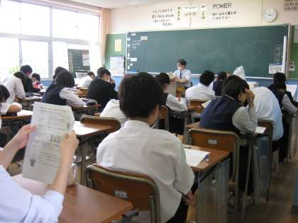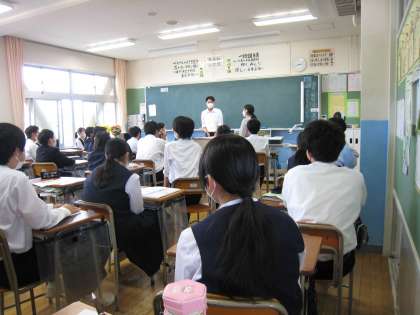 2学年の「総合的な学習の時間」では、7月に行う社会に学ぶ「14歳の挑戦」に向けて、担任から話がありました。