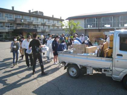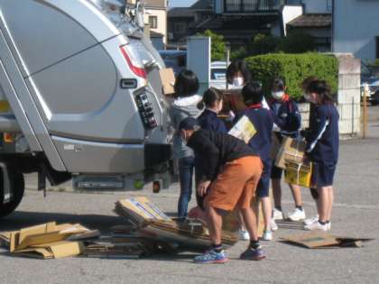 小学校に持ち込まれた回収物は、PTA役員、教員、ボランティア生徒の手で、回収業者が持ってきた回収BOXや収集車両に載せていきました。