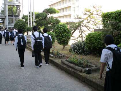 環境委員が金曜日に植えてくれた花壇の横を通って登校しています。