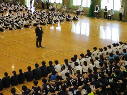 校長先生からは、「日頃の練習で鍛えた技と精神力を存分に発揮してほしい。しかし、勝負は時の運だから、運も味方にしてほしい。心構えだけでも幸運を呼び込むことができる。今日は、『運を呼び込む5つのコツ』について話をします。」