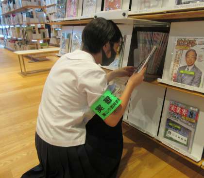 市立図書館では、返却された本を丁寧に本棚へ返していました。館内の整理整頓に励んでいました。