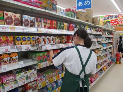 V・ドラッグ町村店では、品出しやビラ配りをしていました。