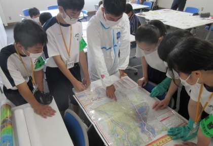 富山中央警察署では、防護服等を着用させてもらいました。その後、校区内の災害危険箇所等をまとめるために、資料を見ながら活発に議論していました。