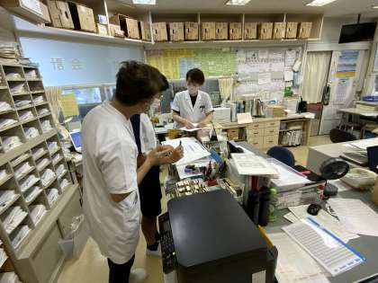 藤の木病院では、薬剤の点検や診察の見学を行いました。写真は、薬剤に関する書類の説明を受けている場面です。普段できない貴重な経験に、新鮮な気持ちで臨んでいる様子がうかがえます。熱心かつ丁寧な仕事ぶりが印象的でした。
