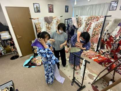 京きものしおんでは、浴衣の着付け体験を行い、日本の文化に触れました。