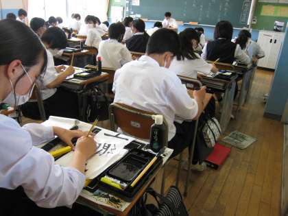 7月14日(木) 今日の2学年の授業の様子です。 上:2−1家庭 中:2−2体育 下:2−3書道