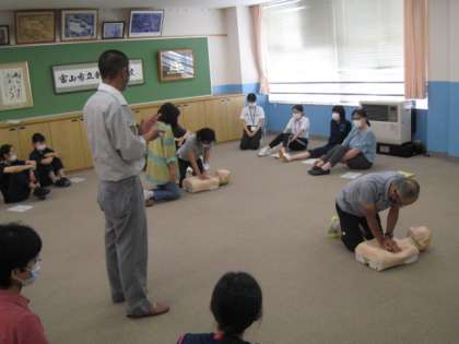 前半は富山消防署北部出張所から消防署員を講師にお招きし、救急救命の講習会、