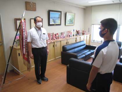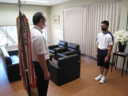 全国中学校体育大会の個人戦に出場する柔道部員が、大会が開催される福島県へ明日出発します。校長室にて、「これまで培った力を精一杯出して頑張ってきます」と意気込みを伝えてくれました。