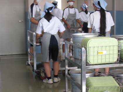 3年計画で順次新しい物に替えています。1年生用のエプロンは、来年度替わる予定です。