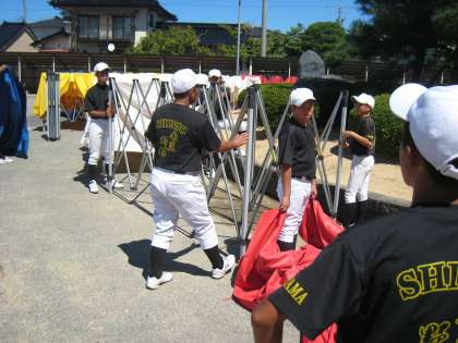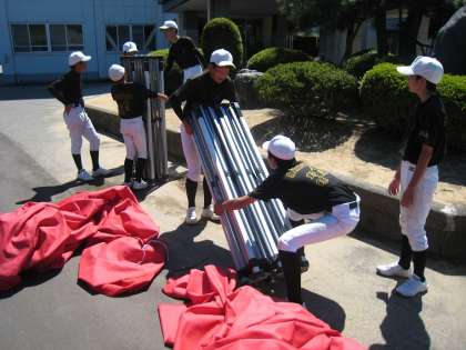 部活に出てきていた野球部が、天気がよかったので練習の合間にテントの幌を干してくれました。