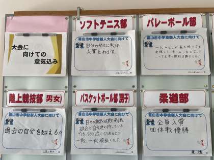 9月12日(月)掲示物紹介「新人大会に向けての意気込み」その1 公開日 2022/09/12 更新日 2022/09/12 部活動 9月16日(金)から行われる運動部の新人大会に向けた「各部の意気込み」が生徒玄関横のスペースに掲げられています。