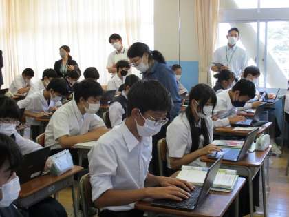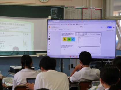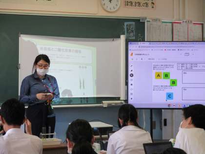 9月21日(水) 研究授業 公開日 2022/09/21 更新日 2022/09/21 2学年 9月21日(水) 研究授業が行われました。 本日の5限の時間に、2年2組で理科の研究授業が実施されました。 市内の若手教諭16名が来校し、授業を参観し、授業の後には協議会を開催し、各自のよりよい授業実践に向けた研修を行います。 本校での研修が、各先生方の勤務校での研鑽の一助となれば幸いです。 生徒達はクロームブックも活用しながら真剣に取り組んでいました。