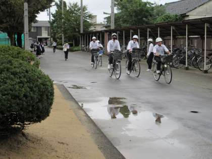登校時間には概ね雨も上がり、水たまりが鏡のようになっていました。