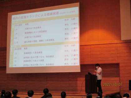 10月7日(金)6限 3学年薬物乱用防止教室 公開日 2022/10/07 更新日 2022/10/07 3学年 10月7日(金)6限 3年生は6限に薬物乱用防止教室に参加しました。 学校薬剤師の方から薬物の使用の危険性や、被害に遭わないために大切なことを学びました。