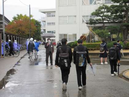 生徒達は、微妙な雨模様に傘をさすか、ささないか悩みながら登校する姿が見られました。