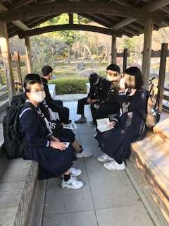 班別学習の終わりに近づいています。たくさん歩き、兼六園の風情あるベンチで一休みしています。
