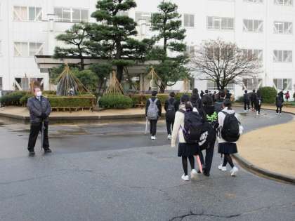 本日は、交通安全街頭指導の日で生徒達は地域の方の見守りを受けながら登校しています。