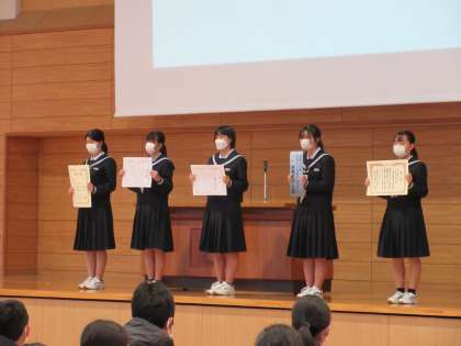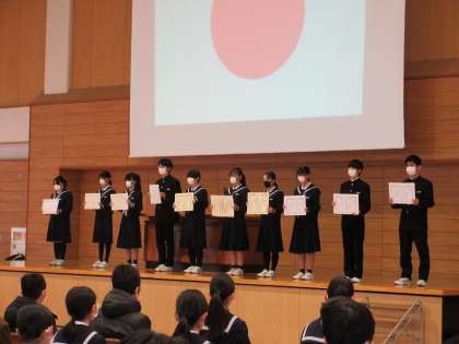 12月23日(金) 受賞報告会 公開日 2022/12/23 更新日 2022/12/23 学校行事 12月23日(金) 受賞報告会 受賞報告会を実施しました。 今学期、部活動や生徒会、作品応募、習い事等、様々な分野において新中生が活躍しました。 頑張った生徒に、大きな拍手が送られました。 来学期の活躍にも期待が膨らみますね。
