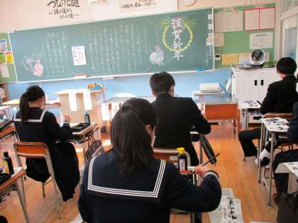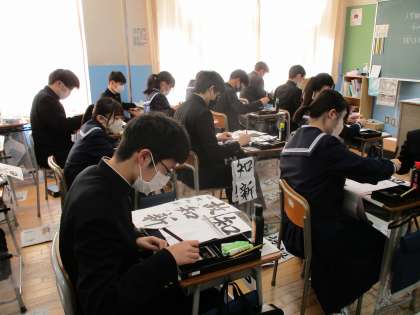 3年 書き初め大会1 公開日 2023/01/10 更新日 2023/01/10 3学年 1月10日(火) 始業式の後は、書き初め大会を行いました。3年生の今年の書き初めは、「温故知新」となっております。一生懸命に練習の成果を出して書いてました。 上:3-1 中:3-2 下:3-3