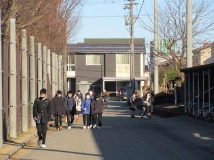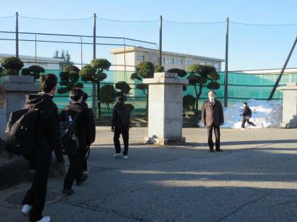 下校時には、職員が通学路の国道にある横断歩道の交通指導に出て、生徒たちの安全を見届けています。新庄中では、このように全生徒が同じ時間に下校する際を活用しながら交通安全の意識の高まりを啓発しています。