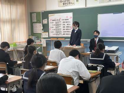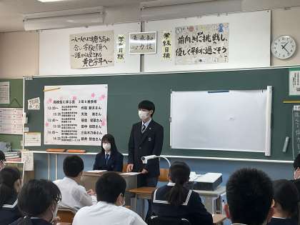 3月9日(木) 高校生に学ぶ会2 公開日 2023/03/09 更新日 2023/03/09 2学年 2年生は、高校生を招いて「高校生に学ぶ会」を行いました。中学校での失敗談や高校生活の魅力を真剣な態度で聴いています。