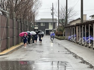 3月13日(月) 朝の登校風景 公開日 2023/03/13 更新日 2023/03/13 そ の 他 3月13日(月) 朝の登校風景です。 いよいよ3年生にとっては新庄中学校で過ごす最後の週となりました。 寂しさを察してか空からは涙雨が落ちてきてます。 名残はつきませんが、このメンバーで過ごすあと3日を大切にしたいですね。 今日はしっとりとしてますが、これから天候も回復し、晴れやかな気持ちで送り出しましょう! さあ、「笑って おはよう!」で今日もスタートです!!