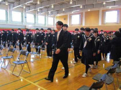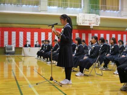 「三年生の皆さん。私たちは先生方や家族に、いろいろと心配をかけました。でも、この仲間と過ごした日々は、一生の宝となりました。コロナに振り回され、自分ではどうにもできないことへの悔しさを感じたこともありましたが、私たちが歩んだ三年間は、これまでの先輩方に負けないくらい、パワーがありました。一つ一つの出来事が、大切な思い出です。私たちの学年のテーマであった「恕」(思いやり)の気持ちを大切にして、それぞれの道を歩んでいきましょう。」と呼びかけました。