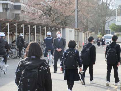 正面玄関前では、3年間毎朝のように生徒たちに「笑って おはよう!」を実践してきた丸山校長が、今日も生徒たちに温かいまなざしを向けていました。