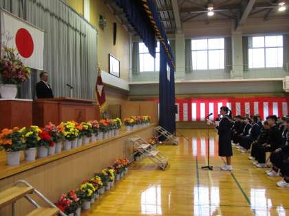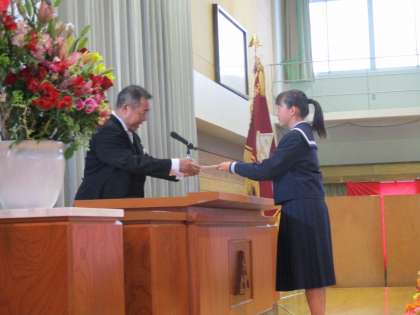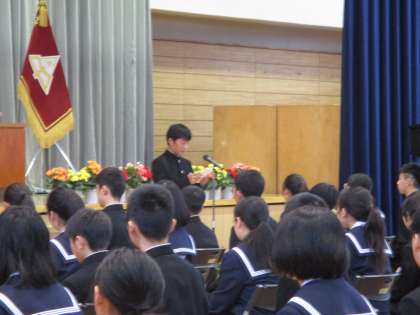 在校生を代表し、生徒会長が歓迎の言葉を述べました。新入生を温かく迎えようと、優しく語りかけていました。
