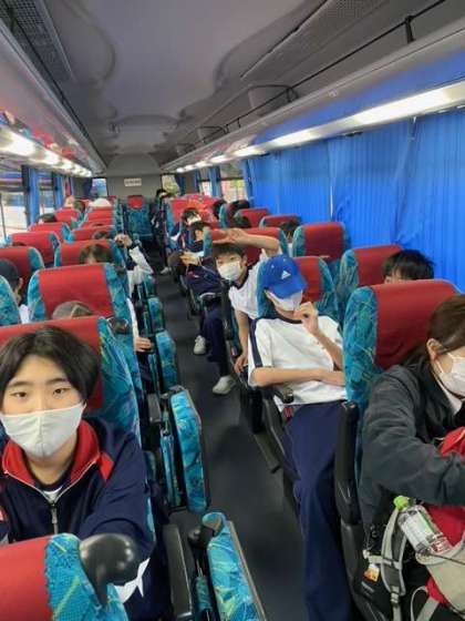 4月26日(水) 1年 宿泊学習 公開日 2023/04/26 更新日 2023/04/26 1学年 本日の参加者の人数を最終確認し、いよいよ宿泊学習開始です。 1組です。7時40分に、お見送りの先生方に手を振り、大阪屋の駐車場を出発しました。