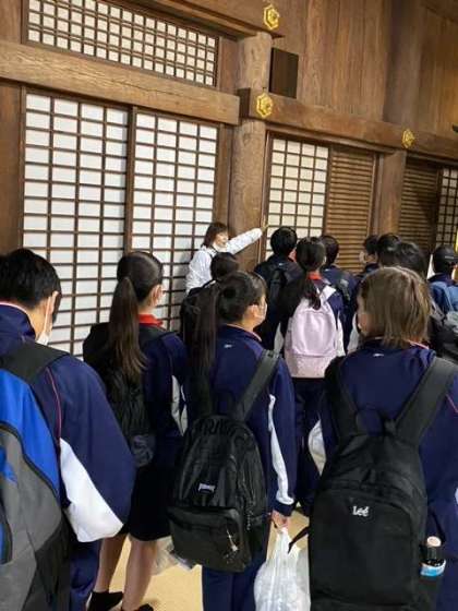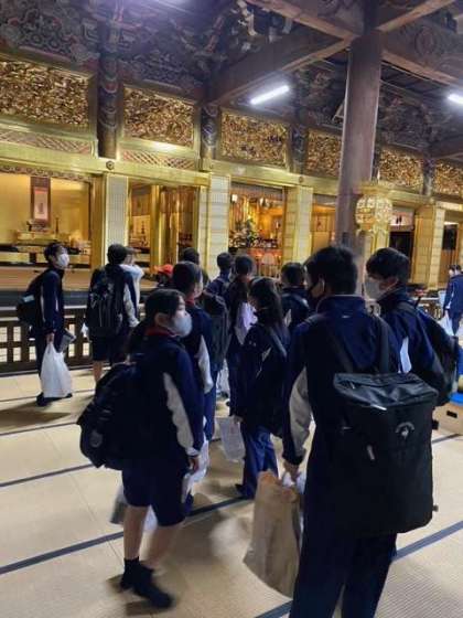 1組です。勝興寺を見学しました。 この後、1組、4組、5組は、次の見学地の万葉歴史博物館に向かいます。
