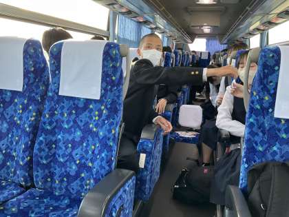 6組です。トイレ休憩を済ませ、出発しました。バス内では、元気な話し声でいっぱいです!