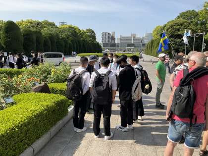6組です。ガイドさんから、原爆についてのお話を聴き、平和記念公園内を案内していただいています。