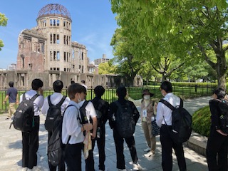 5月10日(水) 3年 修学旅行 公開日 2023/05/10 更新日 2023/05/10 3学年 1組です。碑めぐり 取り壊されようとしていた原爆ドームが何故残されるようになったのか説明を聞いています。