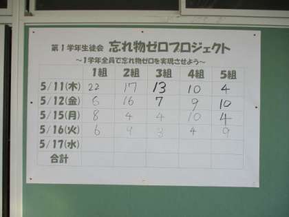班長が中心となって声を掛けており、どのクラスも少しずつ「忘れ物ゼロ」に近付いています!明日で1週目が終わり、折り返し地点となります。まだ「ゼロ」のクラスは出ていません。どのクラスがいち早く「ゼロ」になるのか楽しみですね。