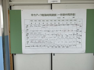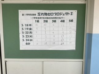 1学年では、学年生徒会で「忘れ物ゼロプロジェクト」を、書記会では、「学力アップ勉強時間調査」を行っていました。中間評価が終了し、本日の終学活時に結果を発表しました。