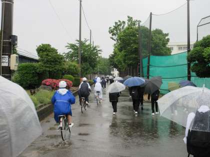 生徒たちも傘や合羽で雨をしのぎながらの登校です。